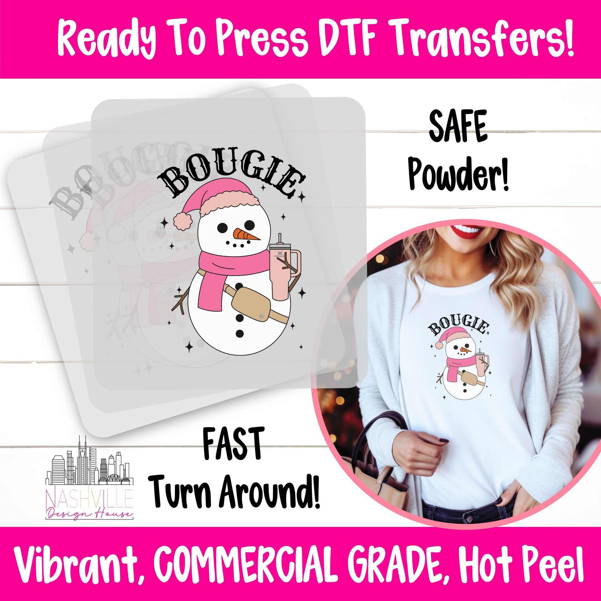 Say hello to the ultimate winter vibe with this Bougie Snowman DTF transfer! Featuring a fashionable snowman rocking a trendy belt bag and sipping from a tumbler, this design is the perfect mix of frosty and fabulous. The bold “BOUGIE” text makes it clear—this snowman doesn’t just survive winter; it slays it. Perfect for T-shirts, tote bags, or dish towels, this transfer is ideal for anyone who keeps it cool while staying stylish, one frothy tumbler at a time.